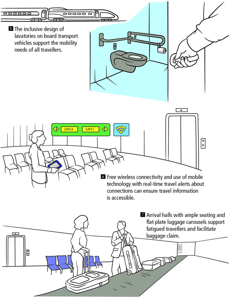 Importantly, the panel concludes that new technological innovations are not the only solutions to make travel obstacle-free; sometimes the best solutions are simple, inexpensive, and already exist. The report points out that increased customer service personnel, inclusivity training, designated lineups, and ample seating in stations and terminals are some simple initiatives that could have a significant impact. New technologies or innovative adaptations such as flat-plate baggage claim devices and apps that support wayfinding are also explored as options for improving the travel experience. The entire report is built upon the premise of the door-through-door journey, drawing on the concept of a multimodal and national system that considers how older travellers in Canada will navigate their journey, from planning the trip to arriving at their chosen destination.